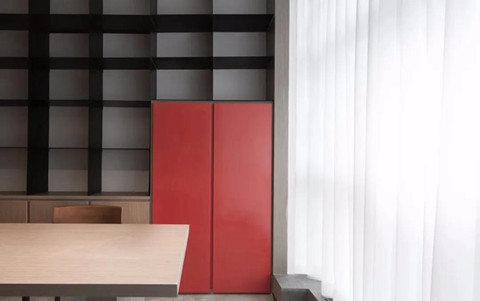 空间中的一抹红跳脱于整体木色,是消防栓的位置,把原本无趣的实用性装置转化成装点空间的亮点,同时也给工作者带来振奋感,探索生活与工作中更多未知的可能。